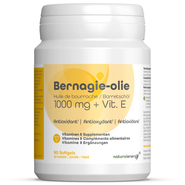Huile de Bourrache pure standardisée à 20 % d’AGL avec Vitamine E qui protège contre le stress oxydant1.