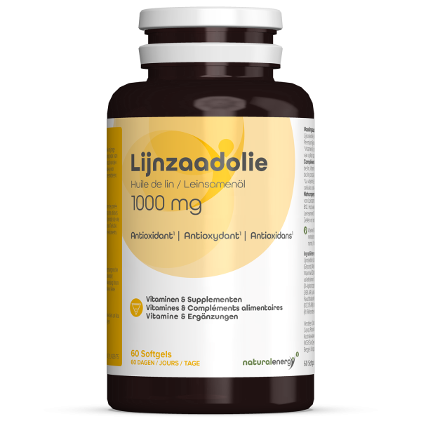 Voedingssupplement op basis van Lijnzaadolie, Vitamine E en Vitamine B12. Premium lijnzaadolie van koude persing.